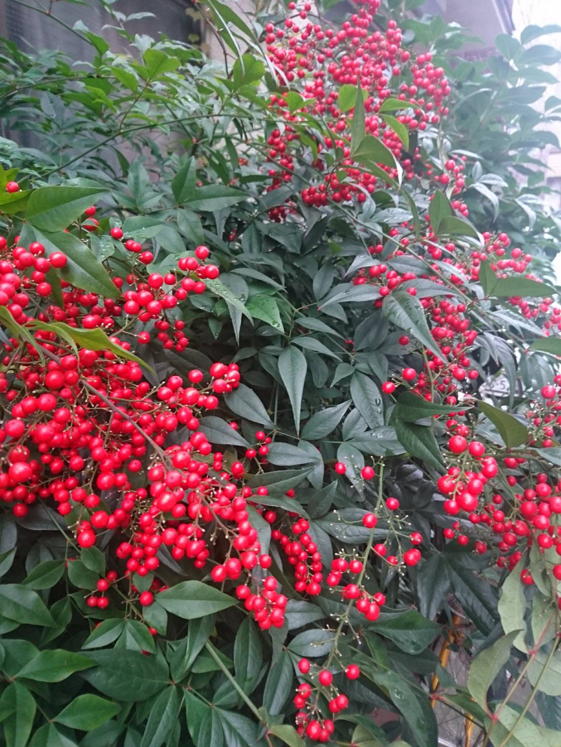 師走に入り街が祝祭気分に賑わいだす頃、南天の実が紅くなります。中国原産で江戸時代前に渡来し、難を転ずる縁起の良い庭木として玄関先、鬼門や裏鬼門に植えられることが多く、佃の古い家や商店の傍らに佇んでいたり月島のマンション植栽に植えられていたり。艶々の赤い実は咳止め漢方薬に使われてきました。南天のど飴、有名ですね。月島緑道や小さな植栽マスに植えられた低木のお多福南天の艶やかな照葉も目を引きます。